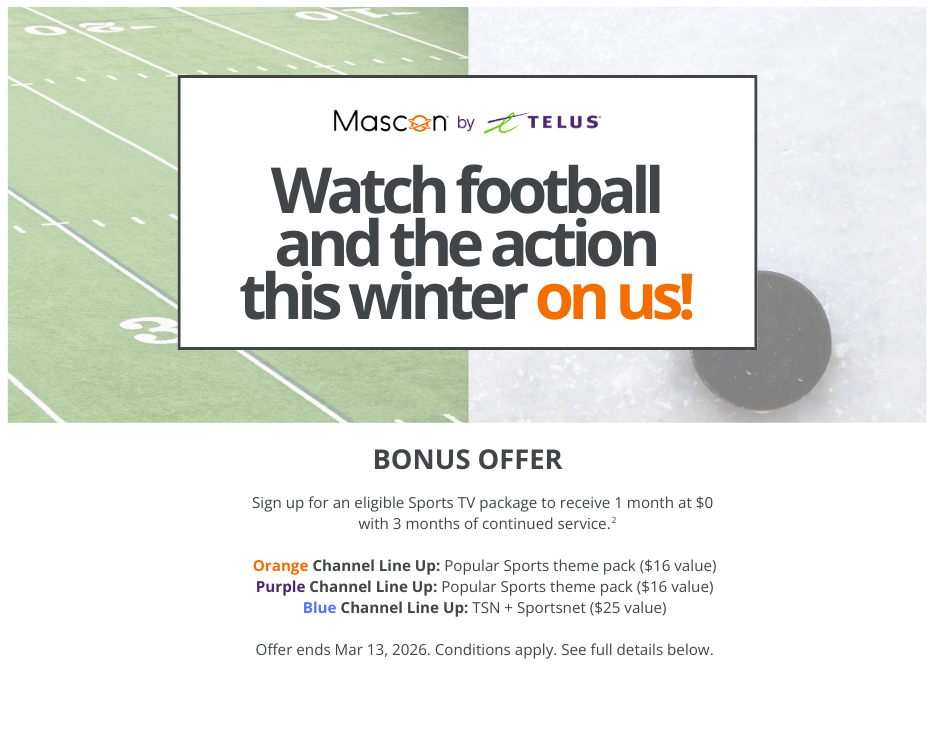 2 Offer subject to change without notice and expires March 13 2026. Available to new and existing Mascon by TELUS TV customers adding an eligible sports television theme pack to the television package or activating a television package with an eligible sports television theme pack. Cannot be combined with other promotional offers. All prices do not include applicable taxes. Minimum system requirements apply. Final eligibility for the services will be determined by a Mascon by TELUS representative. Availability of products and services is subject to geographic, technical and service eligibility. Promotional pricing and packages are not available on legacy or discontinued products, plans, or technologies. In-market offers of channel lineups, packaging and regular pricing subject to change without notice. The promotional offer will not apply if you downgrade below the minimum or cancel before three full months of service for which payment in full is received. Discounts, promotions, benefits and credits are earned for each full month of service for which payment in full is received and do not apply to partial billing periods.