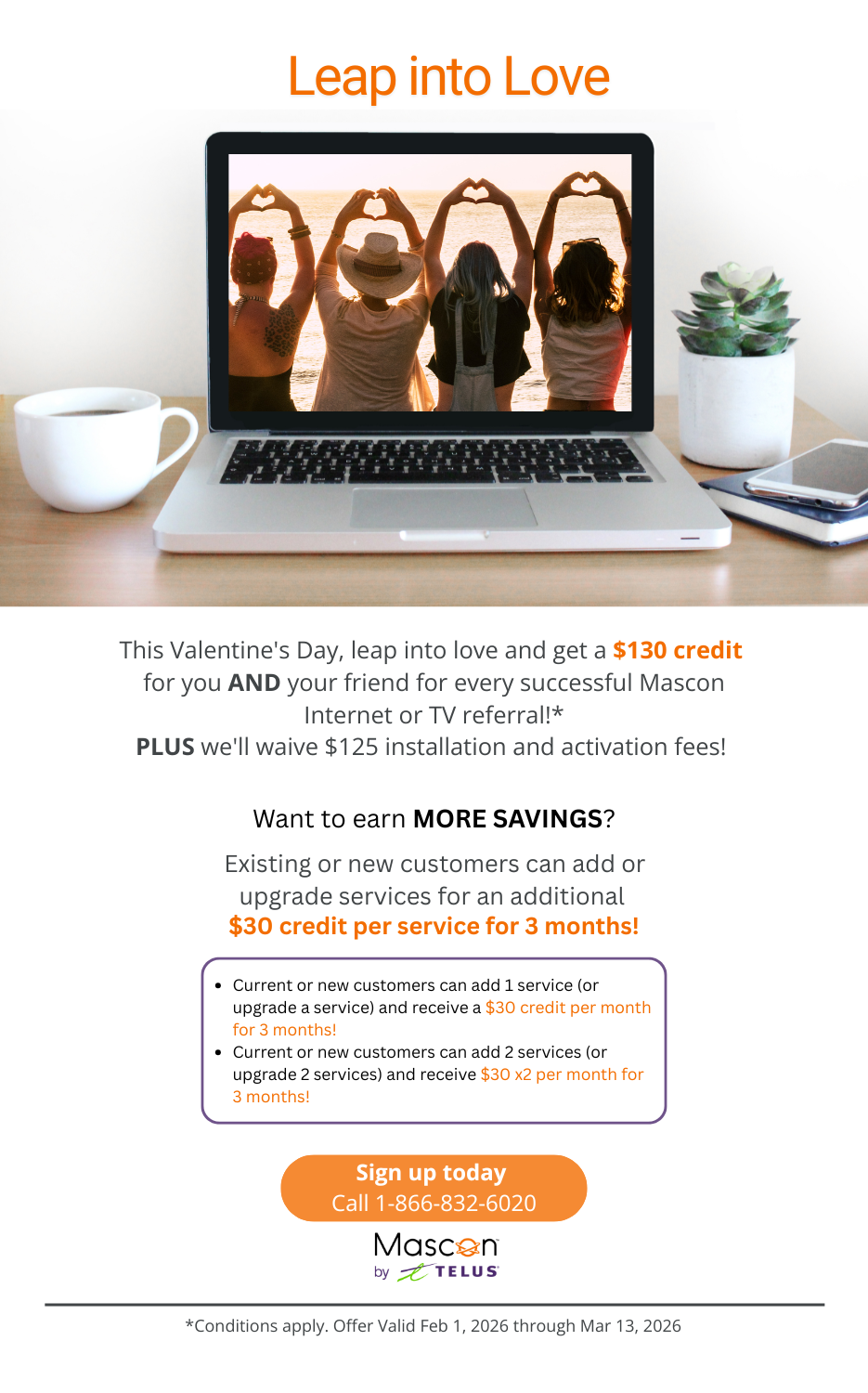 * Offer and regular pricing subject to change without notice and expires March 13 2026. Available to new and existing Mascon by TELUS TV and internet customers activating an eligible TV service. Cannot be combined with other promotional offers. All prices do not include applicable taxes. Minimum system requirements apply. Final eligibility for the services will be determined by a Mascon by TELUS representative. Availability of products and services is subject to geographic, technical and service eligibility. Promotional pricing and packages are not available on legacy or discontinued products, plans, or technologies. The promotional offer will not apply if you downgrade below the minimum or cancel before three full months of service for which payment in full is received. Discounts, promotions, benefits and credits are earned for each full month of service for which payment in full is received and do not apply to partial billing periods.