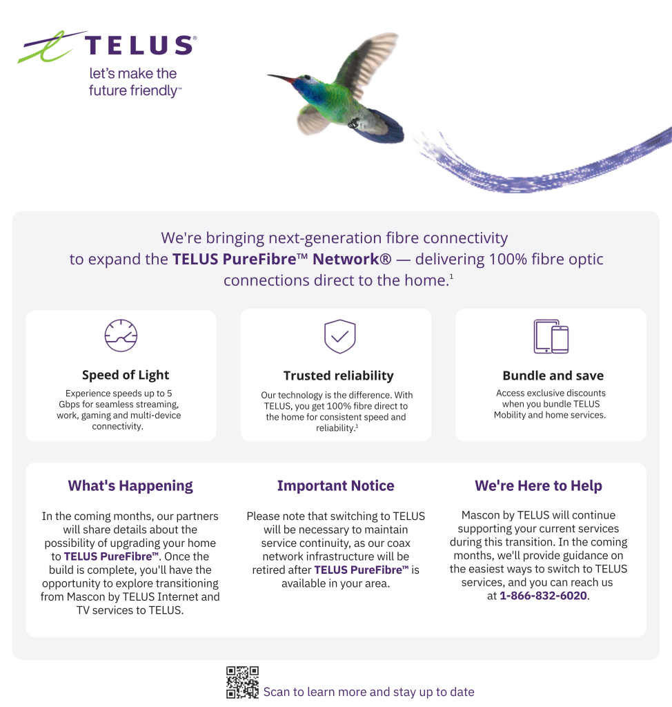 1. Traditional copper wire or Hybrid Fibre Coax (HFC) networks are subject to capacity constraints and environmental stresses that do not affect TELUS fibre optic technology, which is based on light signals. Not available in all areas. Individual results may vary depending on the construction materials of your home, location and configuration of your Wi-Fi modem, location and capabilities of Wi-Fi devices, number of nearby Wi-Fi networks, number of active Wi-Fi devices or other factors. Conditions apply. Final eligibility for the services will be determined by a TELUS representative. TELUS, the TELUS logo, let’s make the future friendly, telus.com, TELUS PureFibre and Optik TV are trademarks of TELUS Corporation, used under licence. All copyrights for images, artwork and trademarks are the property of their respective owners. Screen images are simulated. © 2025 TELUS. All rights reserved. 24-0760-02