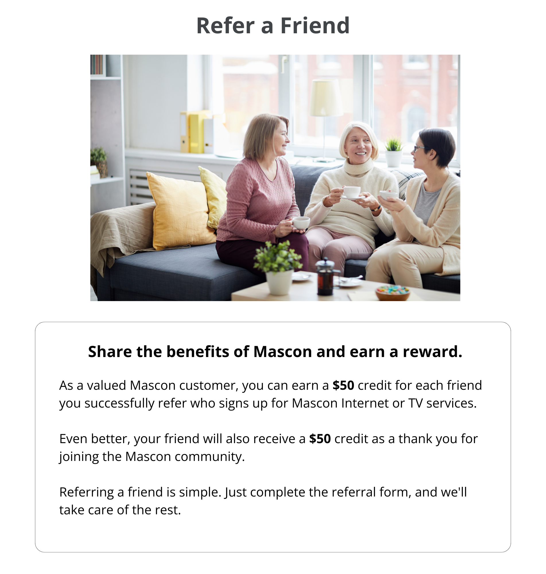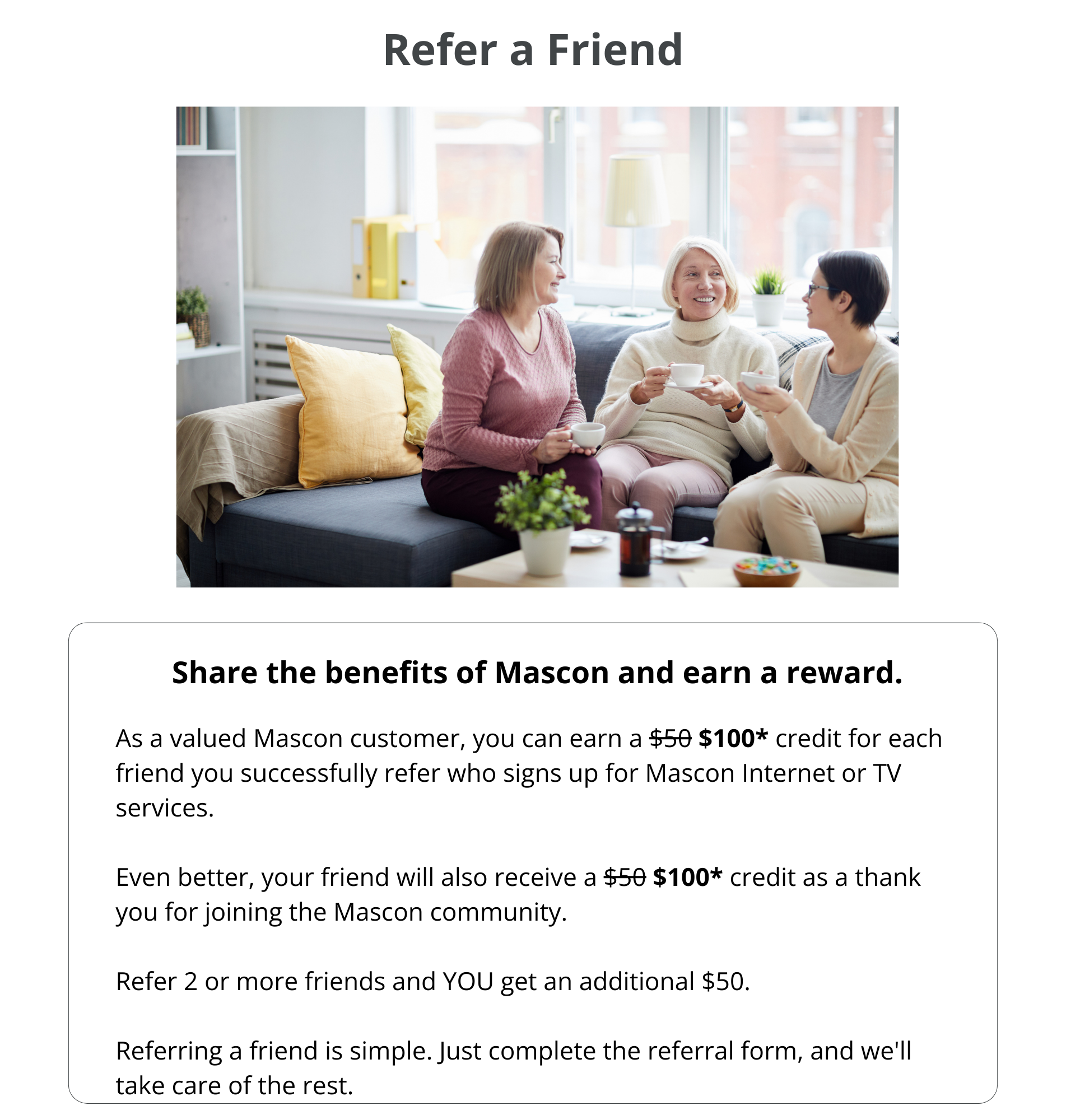 *Refer a Friend terms can be found here. REFER A FRIEND SERVICE APPLICATION YOUR INFORMATION Your Name * Your Email * Your Phone * FRIENDS INFORMATION Your Friends Name * Your Friends Email Your Friends Phone * You agree that your friend is aware of the referral and consents to Mascon contacting them directly.* Reminder: Please do not include any personal information in comments such as Credit Card information or Social Insurance Card number.